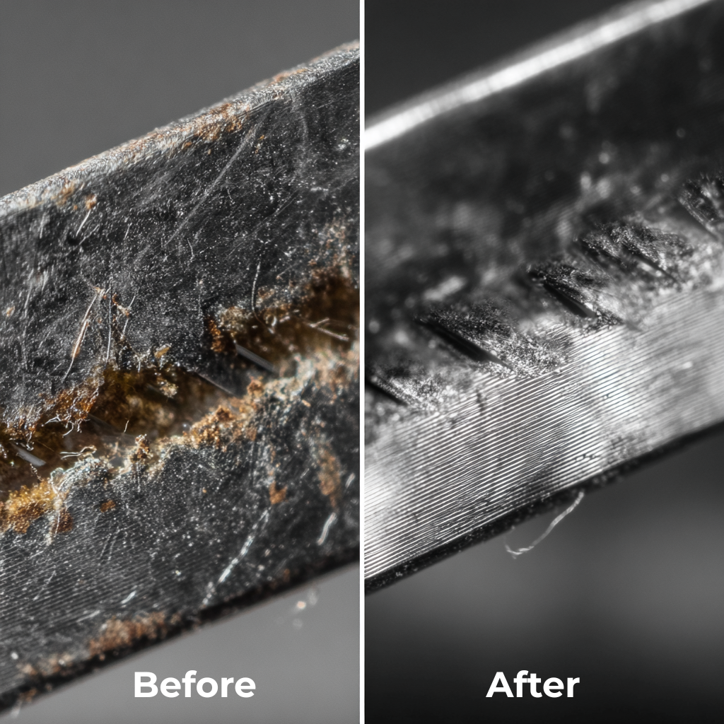“I had a cartridge 6 blade razor that was pulling whiskers—OUCH—and about to be thrown out. After about 20 sharpening strokes on the Galline pad, the blades looked SUPER clean and shiny. The shave was the best I’ve had in a long time, smooth as a baby's butt. This product works as advertised—home run Galline!”